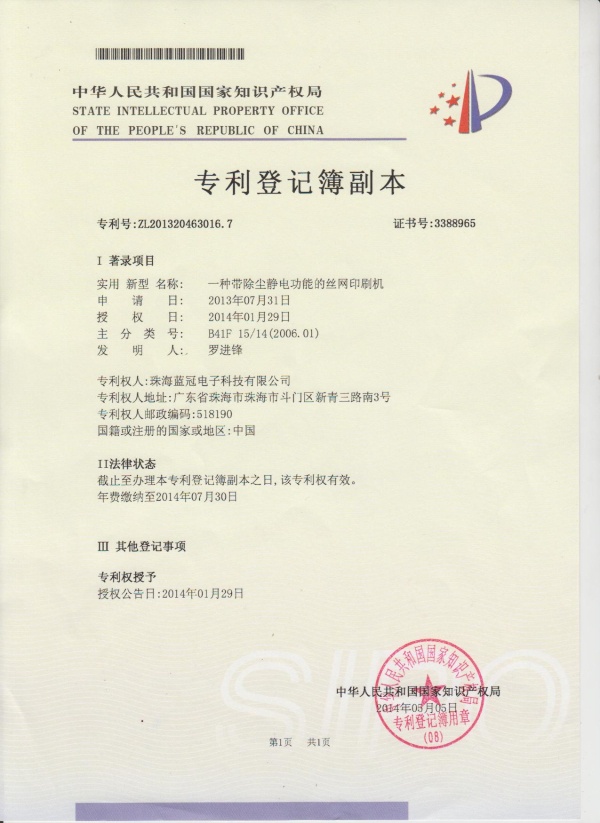 专利登记薄副本(专利号:ZL201320463016.7)